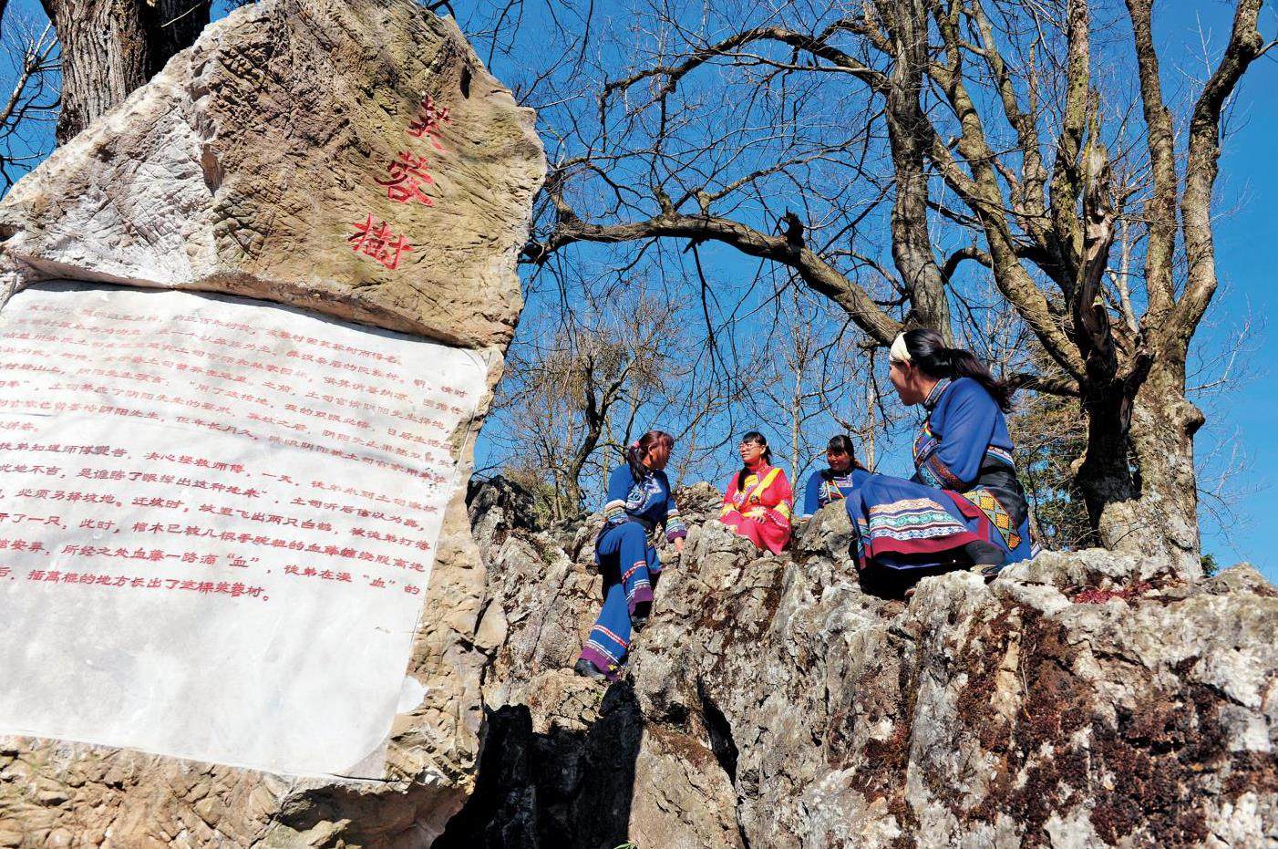 冬季,枝态仓健有力的这一棵老树,正是芙蓉村名字的来源。冬日的阳光下,这棵近千年的老树在蔚蓝天空的映衬下形态挺拔,枝干硬朗,树皮糙沉苍白。然而,仔细一看,树梢顶端已经长出嫩绿的花苞,蓄势待发。几位身着藏青色传统服饰的彝族妇女在正午农闲之余,闲散随意地坐在花树下的岩石堆上,聊家常,晒太阳。
