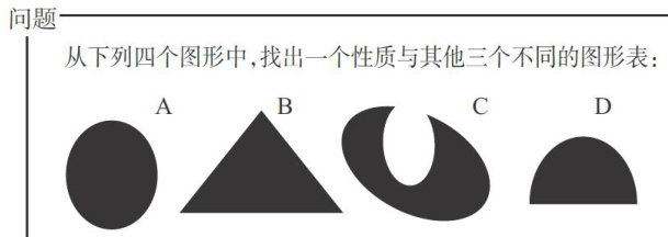 不过,也许有人会选择图形C。因为非对称性图形只有C一个,所以会被认为与其他图形不同。确实如此,这也是正确答案。答A也是可以的。因为A是惟一没有角的图形,所以A也是正确答案。那么,D又怎么样呢?这是惟一一个由直线与曲线构成的图形,因此D也是正确答案。(剩余1139字)