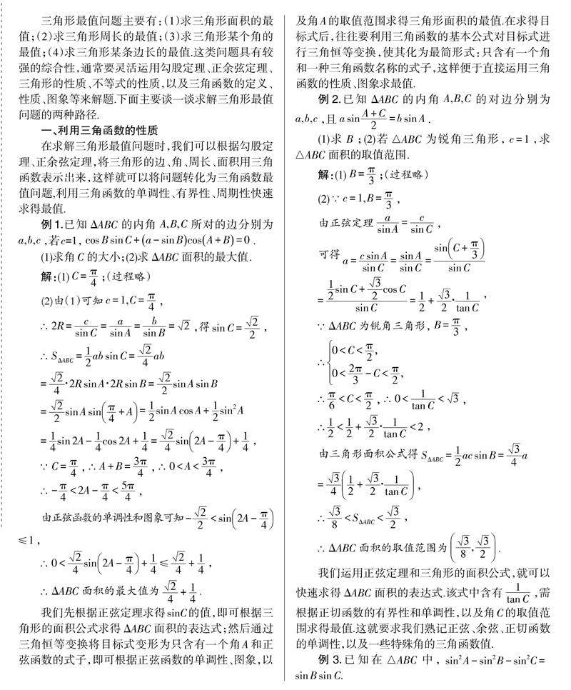三角形最值问题主要有:(1)求三角形面积的最值;(2)求三角形周长的最值;(3)求三角形某个角的最值;(4)求三角形某条边长的最值.这类问题具有较强的综合性,通常要灵活运用勾股定理、正余弦定理、三角形的性质、不等式的性质,以及三角函数的定义、性质、图象等来解题.下面主要谈一谈求解三角形最值问题的两种(剩余1788字)