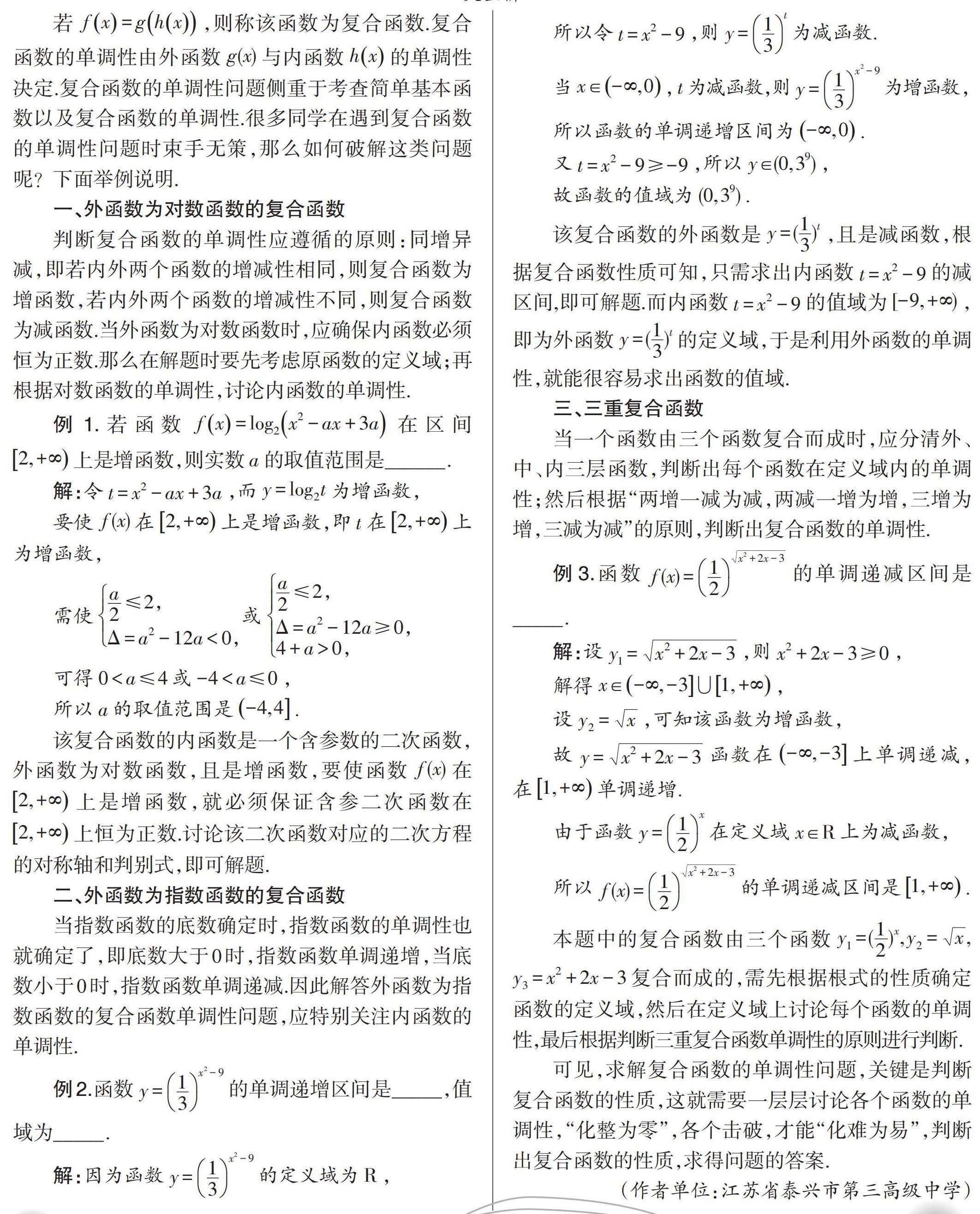 若 f (x)=g (h (x) ),则称该函数为复合函数.复合函数的单调性由外函数 g(x) 与内函数 h (x) 的单调性决定.复合函数的单调性问题侧重于考查简单基本函数以及复合函数的单调性.很多同学在遇到复合函数的单调性问题时束手无策,那么如何破解这类问题呢?下面举例说明.