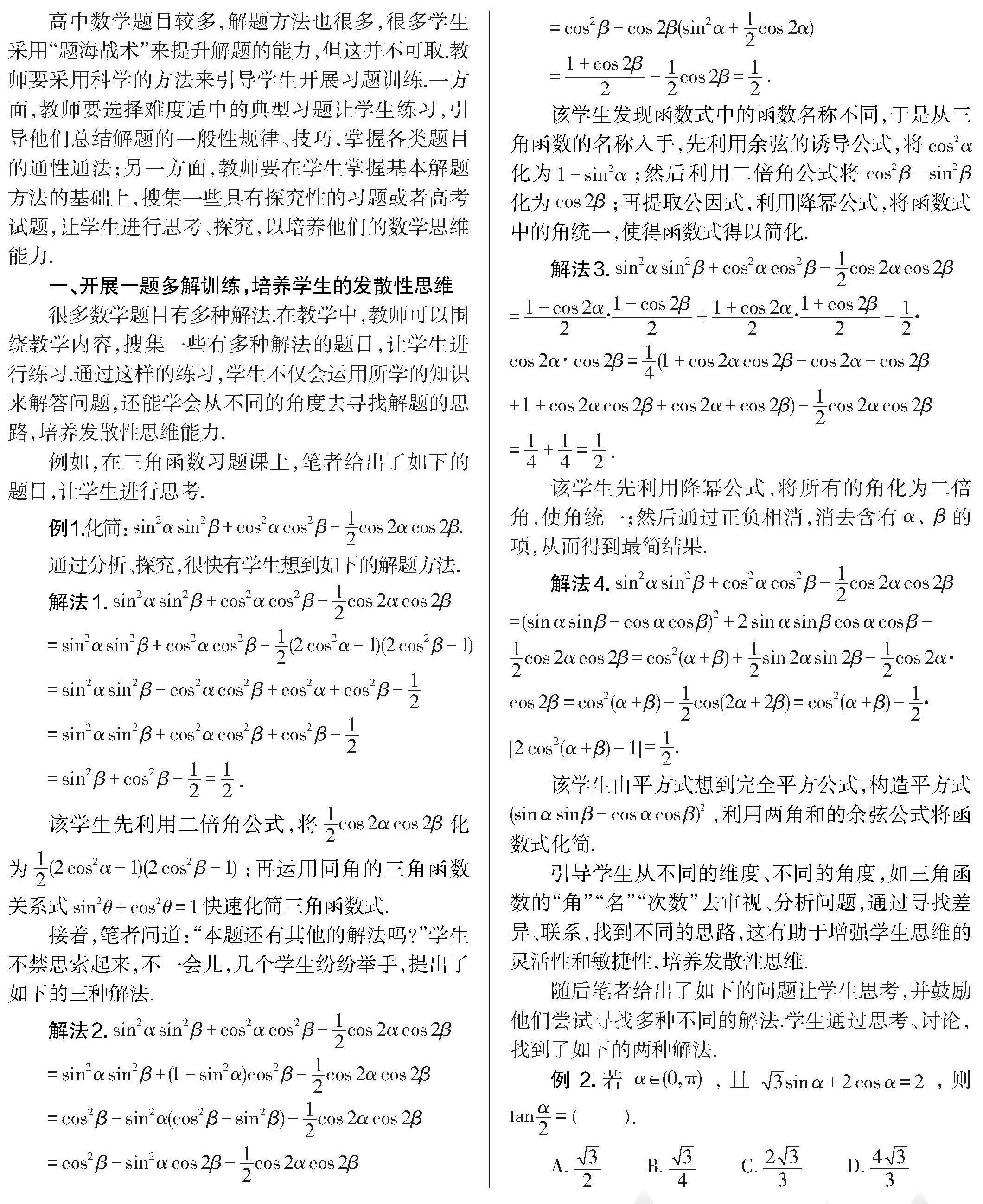 高中数学题目较多,解题方法也很多,很多学生 采用“题海战术”来提升解题的能力,但这并不可取.教 师要采用科学的方法来引导学生开展习题训练.一方 面,教师要选择难度适中的典型习题让学生练习,引 导他们总结解题的一般性规律、技巧,掌握各类题目 的通性通法;另一方面,教师要在学生掌握基本解题 方法的基础上(剩余1605字)