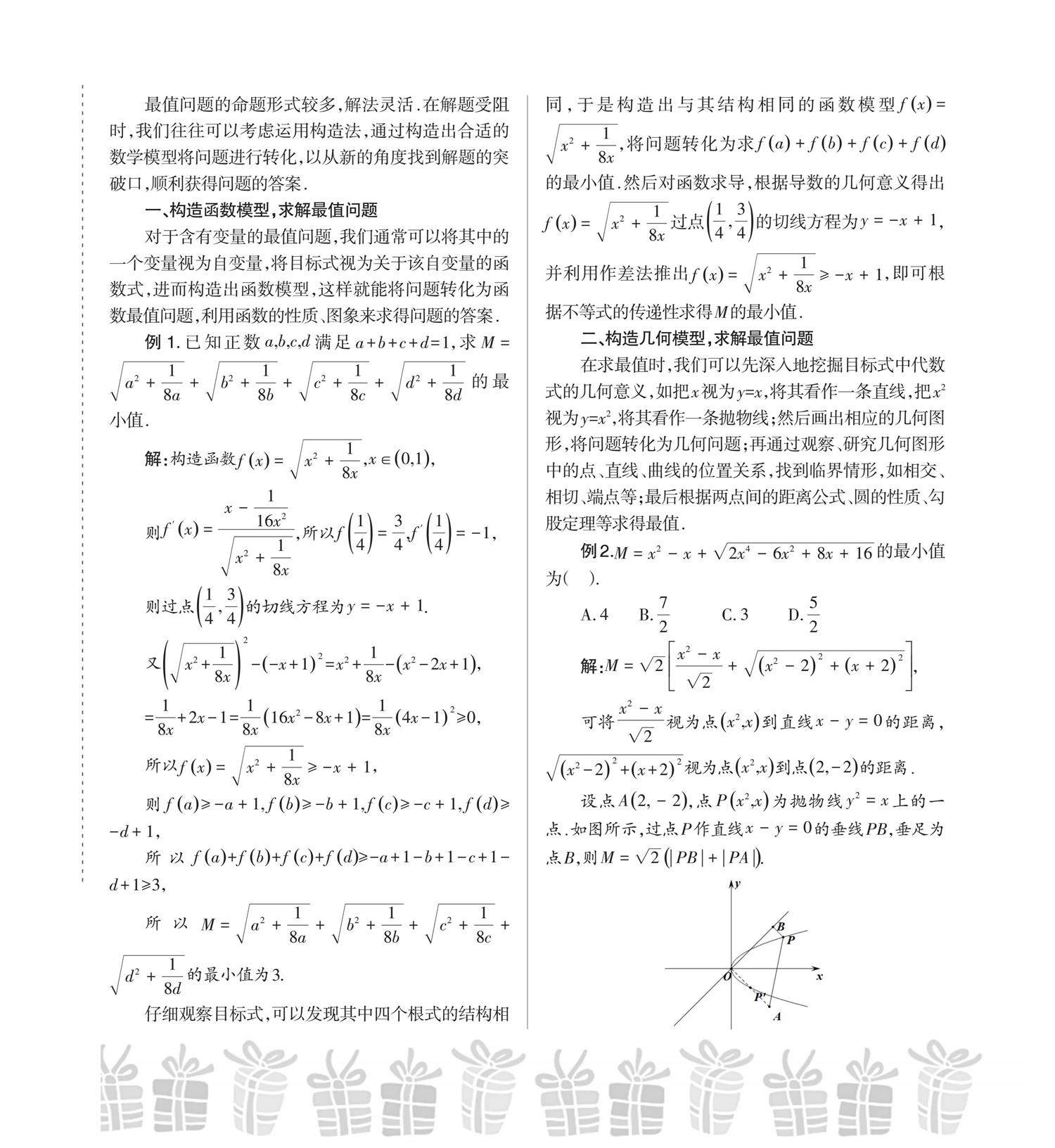 最值问题的命题形式较多,解法灵活.在解题受阻时,我们往往可以考虑运用构造法,通过构造出合适的数学模型将问题进行转化,以从新的角度找到解题的突破口,顺利获得问题的答案.