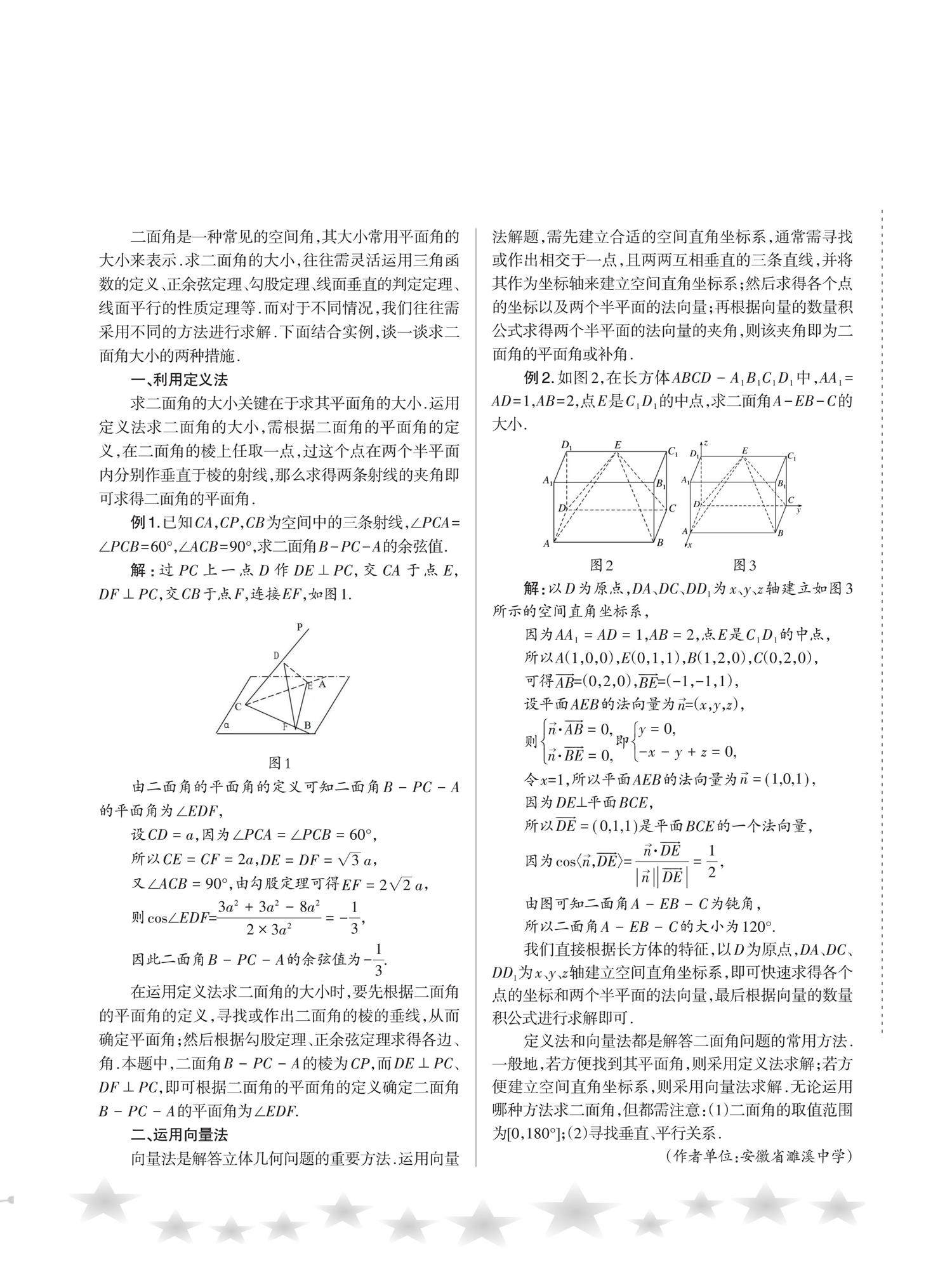 二面角是一种常见的空间角,其大小常用平面角的大小来表示.求二面角的大小,往往需灵活运用三角函数的定义、正余弦定理、勾股定理、线面垂直的判定定理、线面平行的性质定理等.而对于不同情况,我们往往需采用不同的方法进行求解.下面结合实例,谈一谈求二面角大小的两种措施.