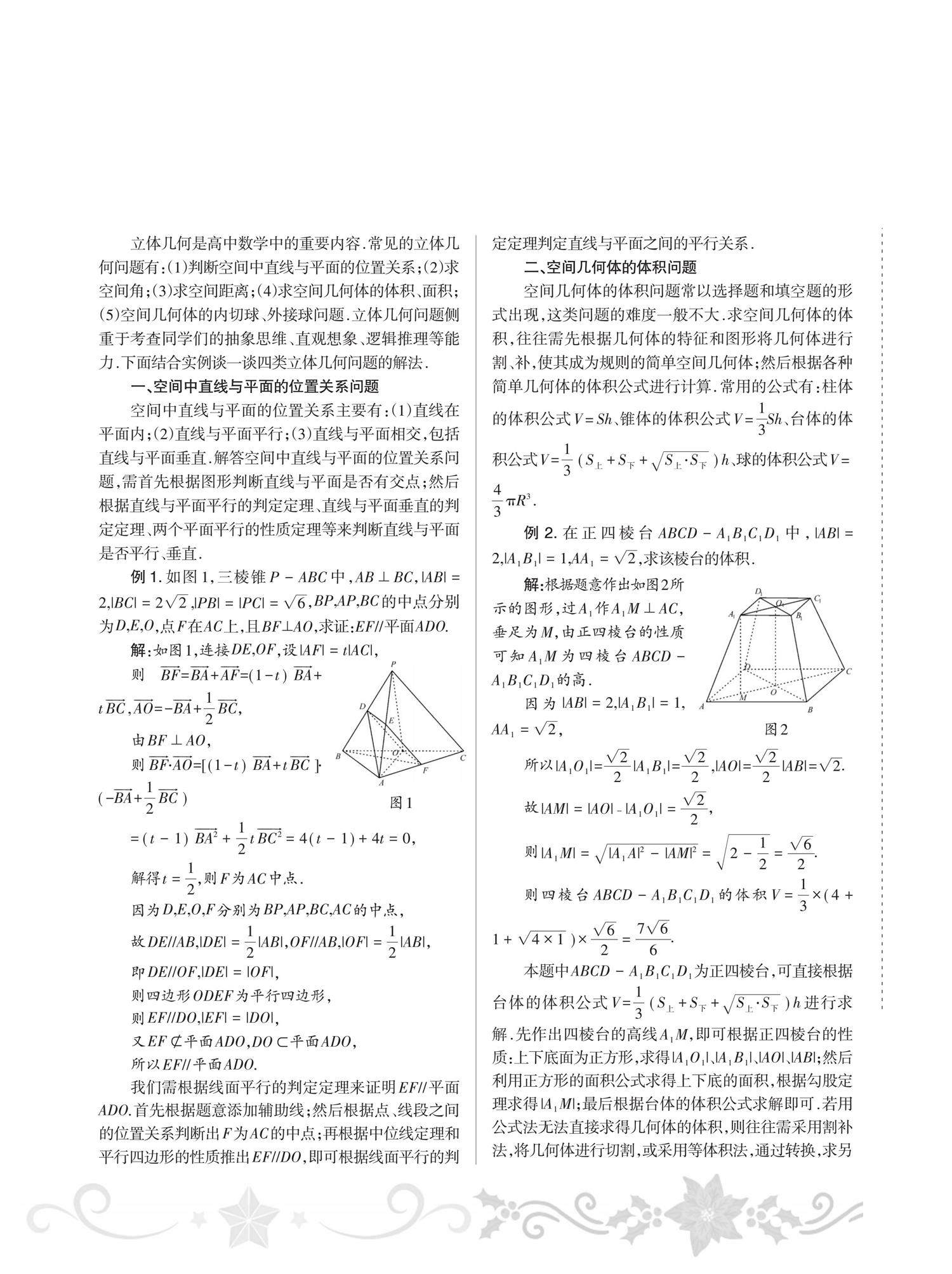 立体几何是高中数学中的重要内容.常见的立体几何问题有:(1)判断空间中直线与平面的位置关系;(2)求空间角;(3)求空间距离;(4)求空间几何体的体积、面积;(5)空间几何体的内切球、外接球问题.立体几何问题侧重于考查同学们的抽象思维、直观想象、逻辑推理等能力.下面结合实例谈一谈四类立体几何问题的解(剩余182字)