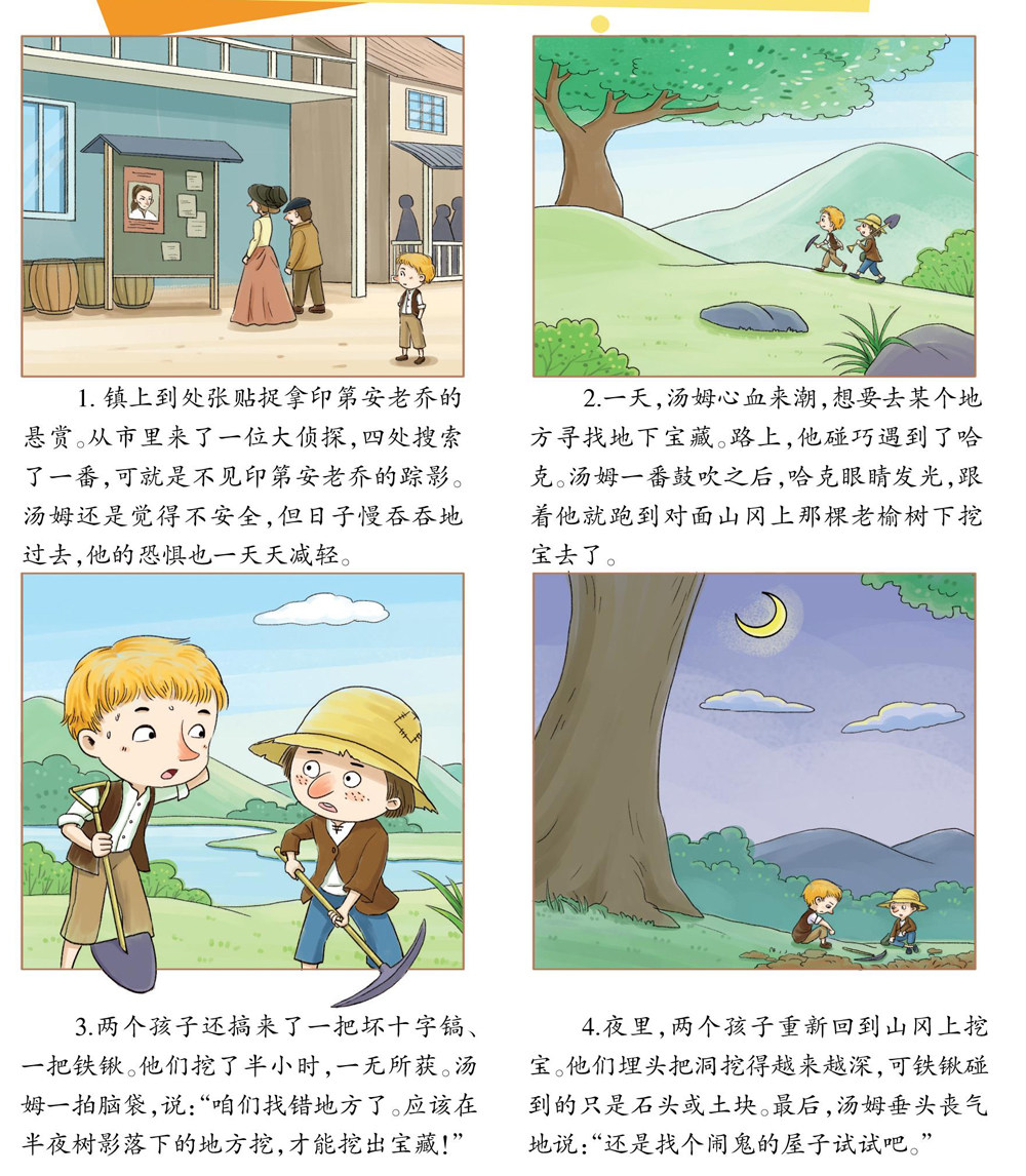 2.一天,汤姆心血来潮,想要去某个地方寻找地下宝藏。路上,他碰巧遇到了哈克。汤姆一番鼓吹之后,哈克眼睛发光,跟着他就跑到对面山冈上那棵老榆树下挖宝去了。(剩余1175字)