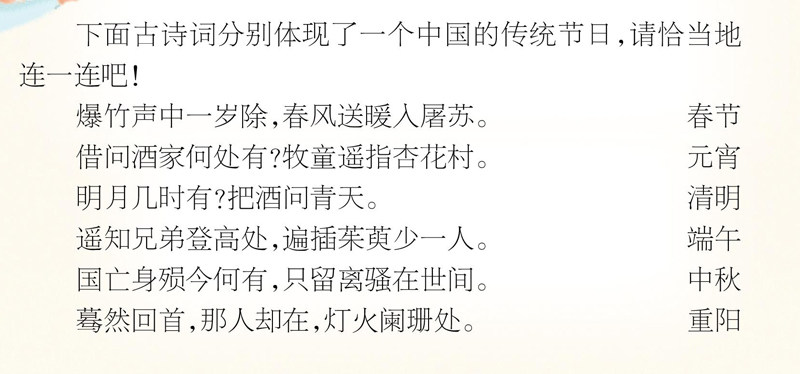 下面古诗词分别体现了一个中国的传统节日,请恰当地连一连吧!