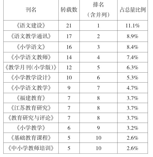 2021年《复印报刊资料·小学语文教与学》(以下简称《小学语文教与学》)共转载论文190篇,分布在45种刊物上。(剩余8793字)
