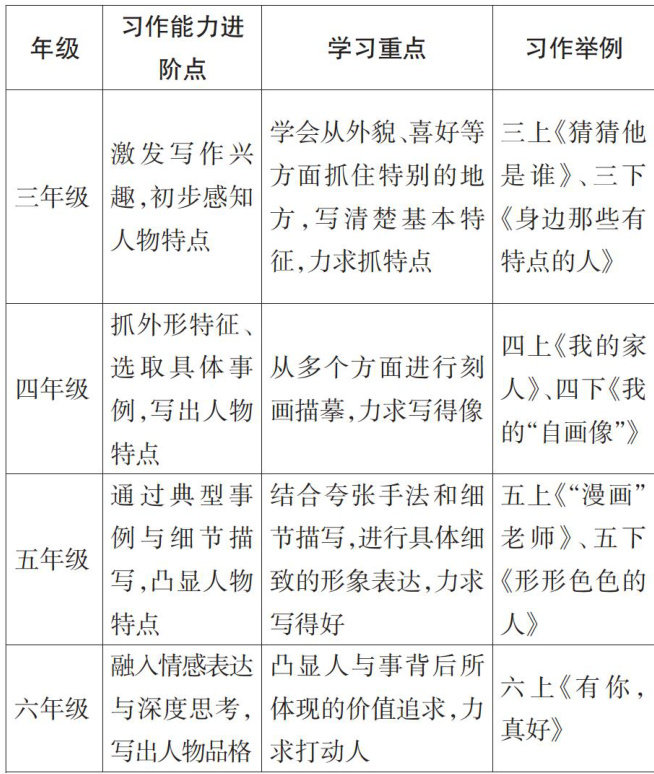 该习作编排图文并茂,通过“导思、导写、导评"三个部分给师生以初步的写作引领。“导思"部分,以四个疑问句提示学生选材方向。教材中的三幅插图,对应三位学科老师,直观形象地凸显了他们的年龄、衣着、外貌等特点,为学生“写什么"打开了思路。(剩余4735字)