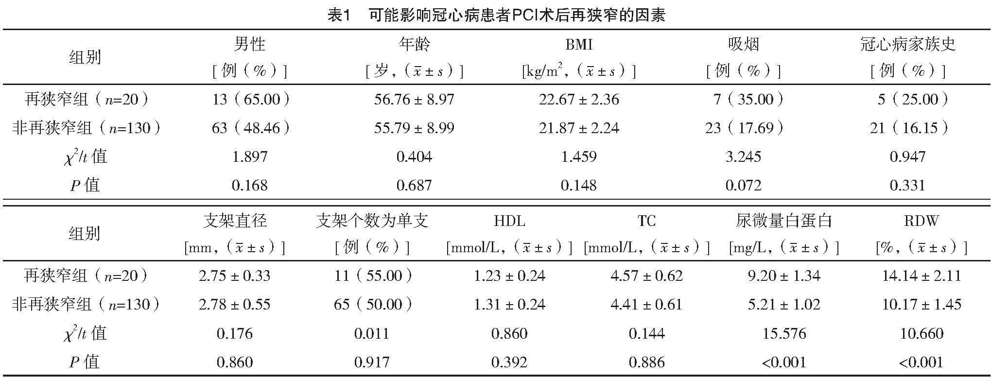 尿微量白蛋白联合红细胞分布宽度对冠心病患者经皮冠状动脉介入术后再狭窄的预测价值