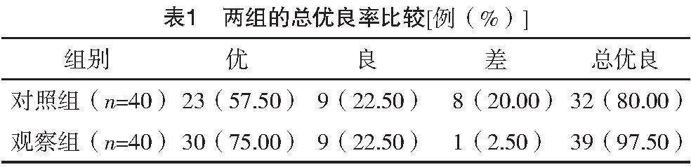 【摘要】 目的:探究早期负重康复训练在跟腱断裂患者中的应用效果及对患肢功能的影响。方法:将2018年1月—2022年5月南安市南侨医院收治的80例跟腱断裂患者根据随机数字表法分为对照组40例和观察组40例。对照组进行常规康复训练,观察组则进行手术后早期负重康复训练。比较两组的总优良率、术后并发症发生率、美国足踝外科协会踝与后足评分(AOFAS-AH评分)、跟腱完全断裂评分(ATRS)及患肢功能(Holden步行功能分级及患肢提踵高度、提踵时间)。(剩余8830字)