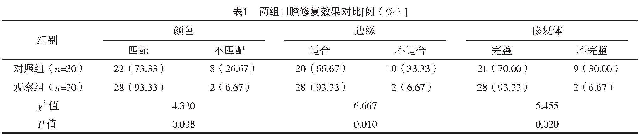 【摘要】 目的:探讨玻璃纤维桩在前牙冠折修复治疗中的效果。方法:选择2020年1月—2021年12月新余市妇幼保健院收治的60例口腔修复患儿,按随机数字表法将其分为两组。对照组(30例)采用铸造金属桩修复,观察组(30例)采用玻璃纤维桩修复,两组均持续随访12个月。对比两组口腔修复效果、牙周碱性磷酸酶水平、牙周袋深度、牙齿功能及不良反应。(剩余8142字)
