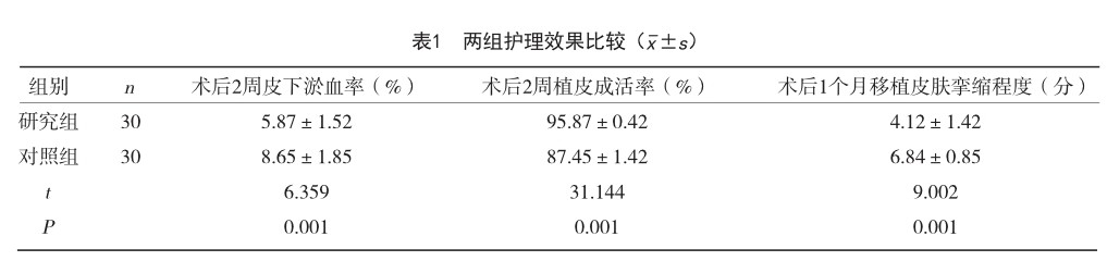 【摘 要】目的 探究在烧伤瘢痕修复患者中使用结构化皮肤护理的应用效果。方法 选取2022年2月-2023年2月我院收治的60例烧伤瘢痕修复患者作为研究对象,按随机数字表法分为对照组及研究组,各30例。对照组采用常规护理,研究组采用结构化皮肤护理,比较两组手术效果、疼痛程度以及焦虑抑郁评分。结果 研究组术后2周皮下淤血率与植皮成活率优于对照组,术后1个月移植皮肤挛缩程度低于对照组(P