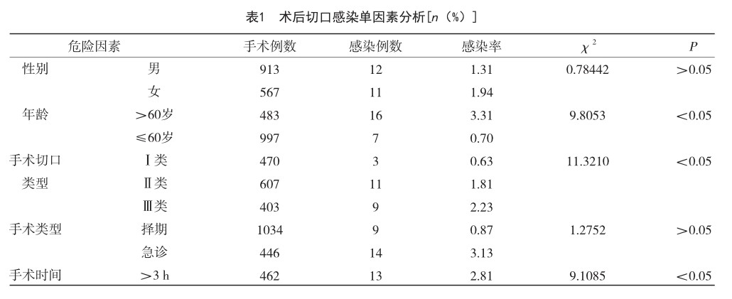 【摘 要】目的 总结骨科手术后患者切口感染的危险因素,探讨切口感染的创面修复处理对策。方法选取2018年2月-2023年2月在我院骨科进行手术治疗的1480例患者为研究对象,采用统计方法收集术后感染情况数据,运用Logistic回归分析法对手术切口感染的危险因素进行分析。结果 1480例骨科手术患者中有23例发生切口感染,感染率为1.55%;单因素分析显示,不同年龄、手术切口类型、手术时间、有无基础疾病、围术期用药、手术部位的切口感染发生率比较,差异有统计学意义(P