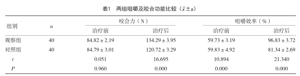 【摘 要】目的 分析牙体大面积缺损后采取纤维桩核修复的临床效果。方法 选取2021年11月-2022年11月收治的80例牙体大面积缺损患者为研究对象,随机分为对照组与观察组,每组40例。对照组采用铸造金属桩核冠修复,观察组采用纤维桩核冠修复治疗,比较两组临床疗效、咀嚼及咬合功能、牙龈功能及并发症发生情况。(剩余5378字)