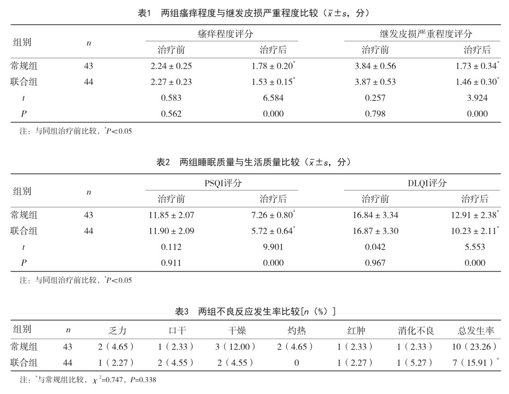 【摘 要】目的 探究中药口服结合熏洗治疗老年皮肤瘙痒症的效果。方法 选取2022年4月-2023年3月我院收治的87例老年皮肤瘙痒症患者作为研究对象,随机分成常规组43例和联合组44例。常规组采取常规治疗,联合组采取常规治疗+中药口服结合熏洗治疗,比较两组瘙痒程度与继发皮损严重程度、睡眠质量与生活质量、不良反应发生率、皮肤瘙痒复发率以及临床疗效。(剩余7120字)