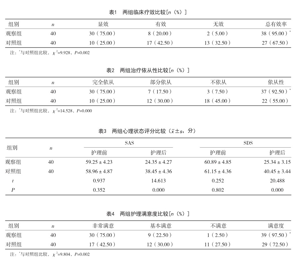 【摘 要】目的 探究个性化口腔护理方式在口腔颌面疾病患者中的应用价值。方法 选取2022年1月-12月我院收治的80例口腔颌面疾病患者,随机分为对照组与观察组,各40例。对照组接受常规护理,观察组在对照组基础上实施个性化口腔护理,比较两组临床疗效、治疗依从性、心理状态评分、护理满意度及并发症发生率。(剩余6855字)