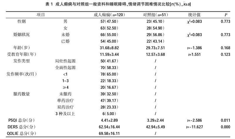 成人癫痫患者睡眠障碍与情绪调节困难、生活质量的关系