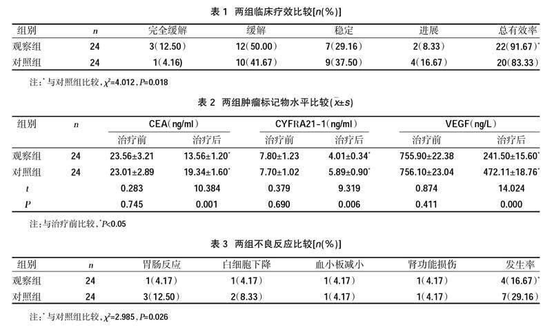 摘要:目的 观察甲磺酸阿帕替尼片治疗晚期非小细胞肺癌的临床效果。方法 选取2020年7月-2021年7月在我院诊治的48例晚期非小细胞肺癌患者为研究对象,采用随机数字表法分为对照组和观察组,各24例。对照组采用常规化疗,观察组在对照组基础上给予甲磺酸阿帕替尼片治疗。比较两组治疗总有效率、肿瘤标记物水平[癌胚抗原(CEA)、细胞角蛋白19片段(CYFRA21-1)、血管内皮生长因子(VEGF)]、卡氏健康评分、中位生存时间及不良反应发生率。(剩余6826字)
