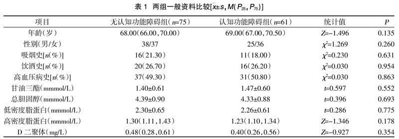 摘要:目的 探讨脑小血管病(CSVD)患者心率变异性(HRV)与认知功能的相关性。方法 选取2021年11月-2022年11月在石河子大学医学院第一附属医院就诊的CSVD患者136例,根据蒙特利尔认知评估量表(MoCA)评分结果将患者分为无认知功能障碍组(MoCA≥26分,75例)和认知功能障碍组(MoCA<26分,61例),比较两组年龄、性别、吸烟史、饮酒史、高血压病史、甘油三酯、总胆固醇、低密度脂蛋白、高密度脂蛋白、D二聚体及HRV指标,采用Spearman相关分析探讨HRV指标与MoCA评分的相关性,采用二元Logistic回归模型分析CSVD患者认知功能障碍的影响因素。(剩余9850字)