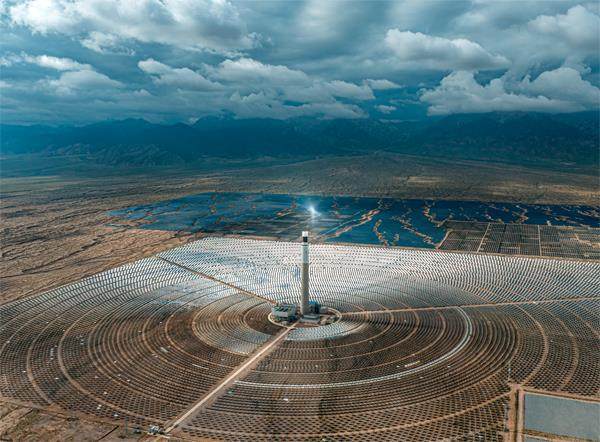 8月5日,青海德令哈,戈壁上的塔式熔盐光热电站光伏板。