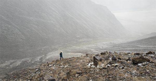 2019年8月30日,金谋顺在大红柳滩西工区等待雪停后测量地质剖面。 摄影/ 赵晓健