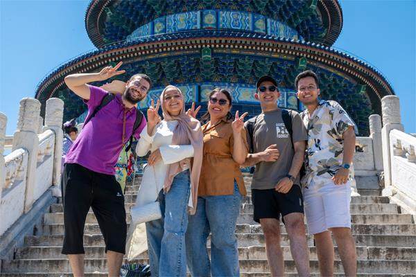 7月17日,北京天坛公园热闹非凡,越来越多的外国旅客慕名前来游览。