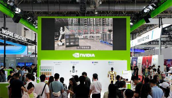 2025年7月16日,第三届中国国际供应链促进博览会在北京开幕。图为在数字科技链展区,首次参展的英伟达展台人头攒动。