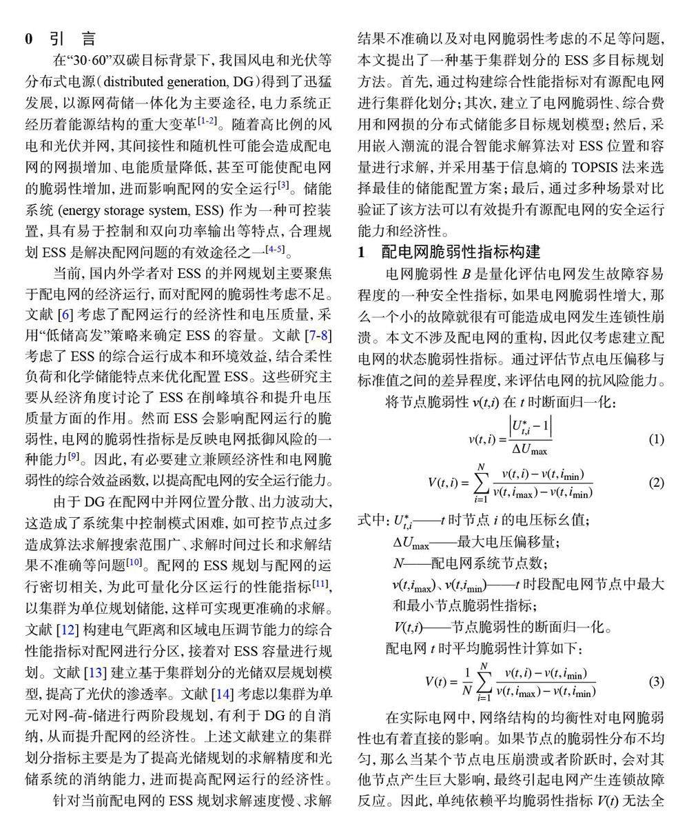 摘 要: 随着新型电力系统中源、网、荷、储资源交互程度的提高,考虑储能与源网荷的时序耦合特性在储能规划中显得尤为重要。为减少有源配电网的网损,提升配网的节点电压水平,并实现削峰填谷的功能,该文提出一种基于集群划分的有源配电网分布式储能选址定容方法。首先,根据配电网电气距离模块度、源荷有功匹配度以及集群功率波动度对有源配电网进行集群划分;其次,以集群为单位对储能进行规划,以电网脆弱性指标、有功网损、综合费用最小为目标,通过嵌入潮流的混合智能求解算法求解储能系统的位置和容量;最后,在改进的IEEE-33 节点系统中进行仿真测试。(剩余1314字)