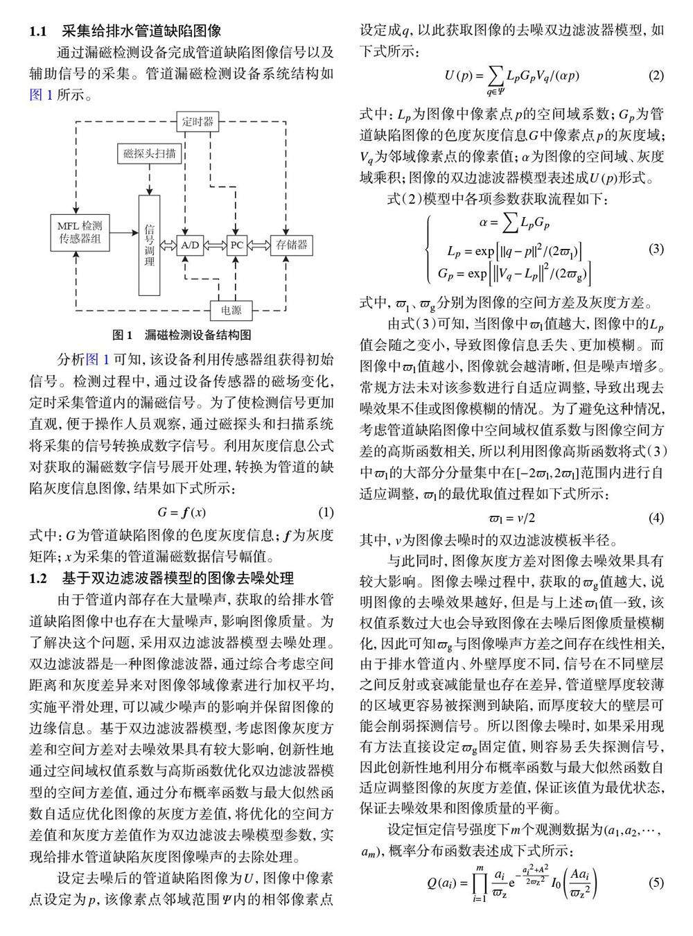 摘 要: 建筑给排水管道缺陷具有时变性,且管道构造较为复杂,导致缺陷训练样本的特征混淆频发,如何通过有效图像特征学习提升缺陷识别精度成为研究难点。为此,该文提出一种样本特征混淆缺失约束下建筑给排水管道典型缺陷图像检测方法。通过漏磁检测设备采集管道缺陷图像数据;采用双边滤波器模型实施图像数据去噪处理,创新性地优化双边滤波器模型的空间方差值和灰度方差值;通过插值算法对去噪管道缺陷图像实施平滑处理,利用最佳梯度搜索完成缺陷区域图像的阈值分割;根据图像阈值分割结构,将近似像素灰度值映射至对应空间中,将获取的阈值分割图像简化为一张二维图像,以此获取图像的全局特征;通过局部二值模式对图像局部区域中心像素大小实施量化处理,获得局部特征;使用卡方距离算法对典型缺陷样本与测试样本之间的全局和局部特征距离展开计算,结合最近邻分类器对管道缺陷图像完成检测。(剩余1400字)