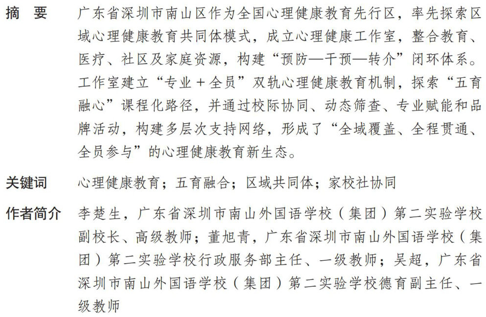 2023年,教育部等十七部门印发《全面加强和改进新时代学生心理健康工作专项行动计划(2023一2025年)》,明确提出“健全多部门联动和学校、家庭、社会协同育人机制”的要求。广东省深圳市南山区作为全国心理健康教育先行区,率先探索区域心理健康教育共同体模式,成立心理健康工作室(以下简称“工作室”),整合教育、医疗、社区及家庭资源,构建“预防一干预一转介”闭环体系,形成了“全域覆盖、全程贯通、全员参与”的心理健康教育新生态。(剩余3084字)