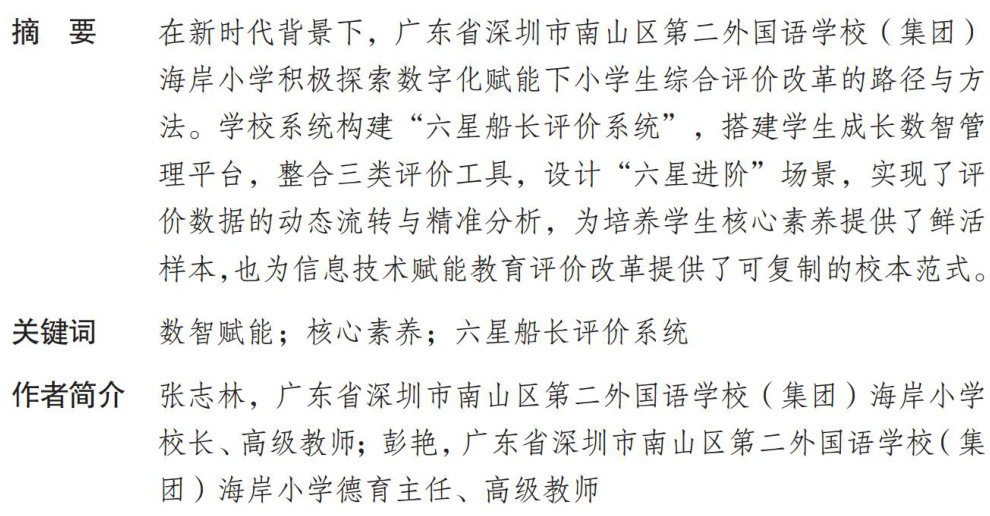 2020年,中共中央、国务院印发《深化新时代教育评价改革总体方案》,明确提出要“充分发挥教育评价的指挥棒作用”,并强调“改进结果评价、强化过程评价、探索增值评价、健全综合评价”。在教育数字化转型的背景下,如何让评价真正成为撬动学生全面发展的支点,已成为基础教育改革的重要课题。直面传统评价中体系不够融贯、标准不统一、效率偏低、激励不全面等问题,创新打造“六星船长评价系统”,构建“136”数智评价模型(搭建一个覆盖全时空的学生成长数智管理平台、融合三类评价工具、设计六星进阶式激励机制),实现了评价数据的动态流转与精准分析,为培养学生核心素养提供了鲜活样本,也为推动信息技术与教育评价的深度融合开辟了可行路径。(剩余2656字)