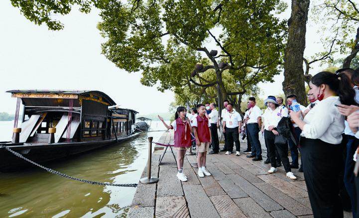 图 | “红船小讲解”在南湖红船旁为游客讲解中国共产党从这里起航的故事