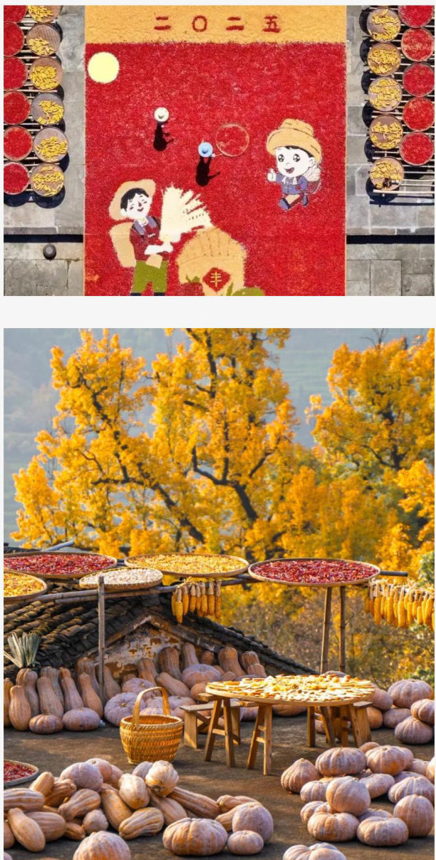辣椒凝着热烈,南瓜透着甜润,黄玉米缀着暖阳…农人们将辛劳一年的果实,铺展在屋顶、窗台与山野间,静静晾晒在秋日暖阳下,仿佛打翻了大地“调色盘”。(剩余30字)