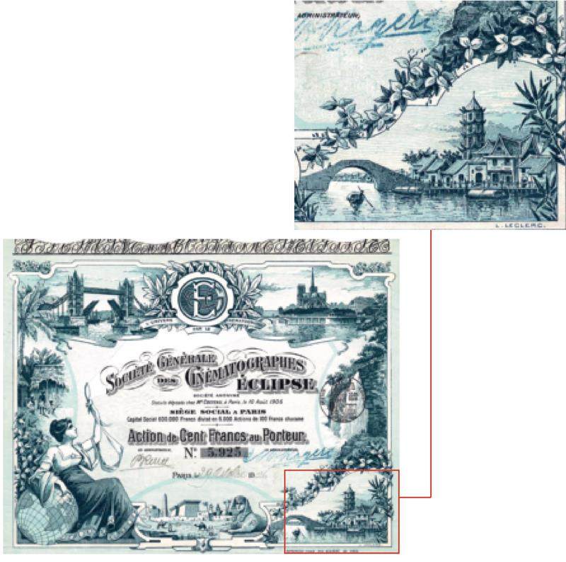 在这张由法国伊柯丽斯电影制片公司发行的股票右下角,设计者用中式古塔、石拱桥、乌篷船等元素勾勒出了一幅中国江南图画。