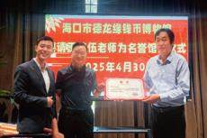 海口市德龙缘钱币博物馆创始人刘德龙(左)向王培伍(右)颁发聘书。