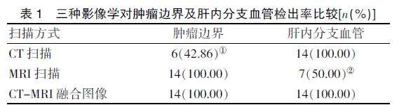 [摘要] 目的 探究多模态影像融合技术在肝内胆管癌诊断与治疗中的应用价值。方法 选取2019年1月至2020年10月辽宁中医药大学附属医院收治的14例肝内胆管癌患者,均接受CT、MRI检查,并建立CT-MRI融合图像肝脏3D模型,观察三种方式术前评估结果、手术规划方案与实际手术方式情况。结果 CT-MRI融合图像对分支血管检出率均为100.00%,MRI扫描中分支血管检出率为50.00%,差异有统计学意义(P<0.05);CT-MRI融合图像对肿瘤边界检出率均为100.00%,CT扫描中肿瘤边界检出率为42.86%,差异有统计学意义(P<0.05);CT-MRI融合图像手术规划方案符合率均为100.00%,较CT(57.14%)、MRI(71.43%)高,差异有统计学意义(P<0.05)。(剩余8189字)