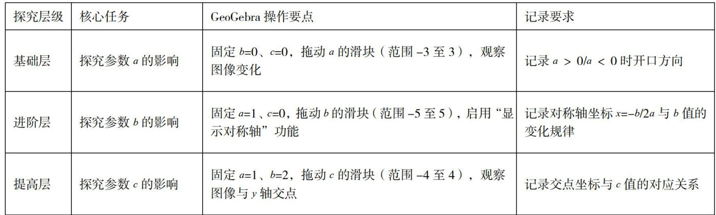 探究式教学强调以学生为中心,通过问题引导、自主探索和合作交流,帮助学生构建知识体系并发展高阶思维能力。GeoGebra以其直观的可视化、动态交互和跨学科整合能力,能够有效降低数学抽象性带来的认知障碍,使学生能够在“做数学”的过程中深化理解,培养数学建模、逻辑推理等核心素养[]。