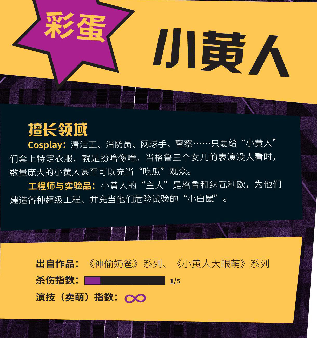 工程师与实验品:小黄人的“主人”是格鲁和纳瓦利欧,为他们建造各种超级工程、并充当他们危险试验的“小白鼠”。(剩余2284字)