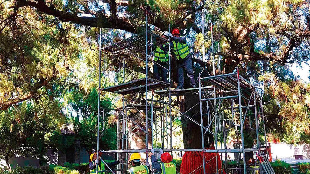 2023年12月4日,在孟州市西虢镇韩愈墓园内,几名身着“古木保护”马甲的工人正在对两株有1200余年历史的唐柏进行地面环境改良、补充营养、树洞修复等复壮维护。