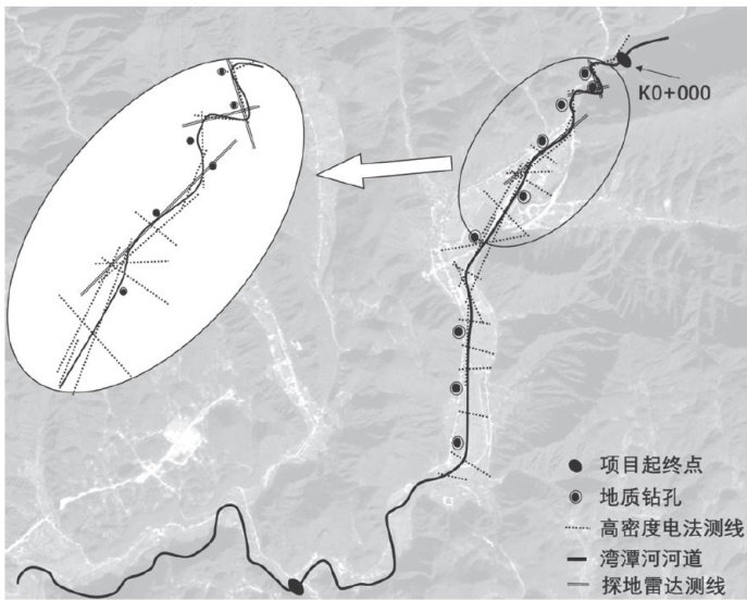 工程治理范围和勘察布置方案如图1所示。湾潭河治理工程范围从湾潭河二道河取水坝,向下游至湾潭2号桥 5.6km 河段,包括湾潭城镇范围,治理工程河谷高程1140m~1170m 。前期基础勘察工作发现工程区地貌以碳酸盐岩溶蚀~侵蚀地貌为主,溶蚀洼地和溶蚀槽谷特别发育,并发育有大量溶蚀漏斗和落水洞。(剩余3802字)