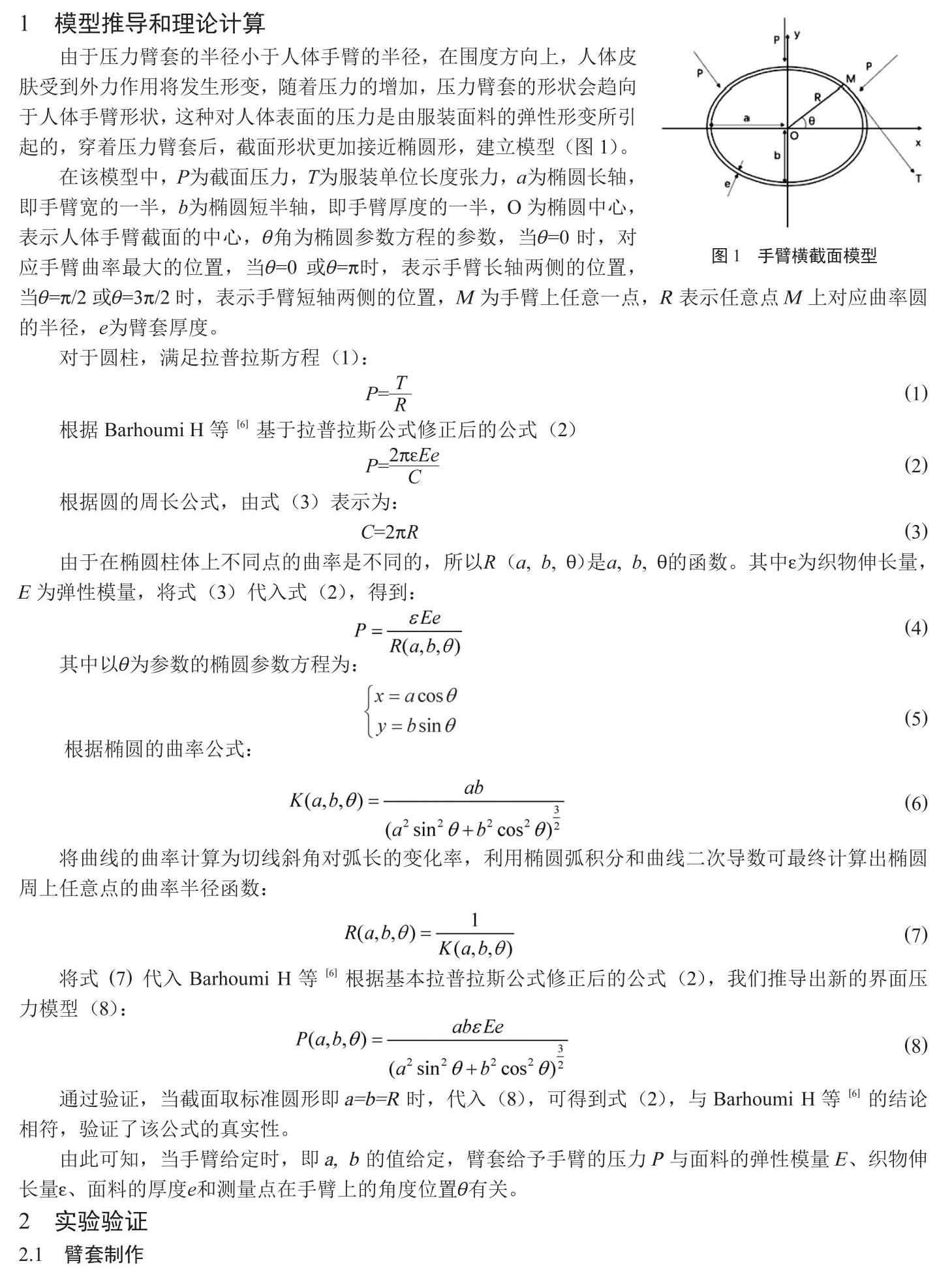 摘 要:压力套对于多种病症有辅助治疗效果,而压强的合理分布至关重要。针对现有基于正圆截面拉普拉斯公式计算的压强分布不能准确表述近似椭圆的人肢体截面压强分布问题,采用以椭圆截面模型的拉普拉斯公式,确立了压力套在截面上的压强分布计算公式;本文使用3种不同材质和厚度的面料,各缝制了4种不同压缩比的压力臂套,测量椭圆截面不同位置的压强,并与计算值进行比较。(剩余6348字)