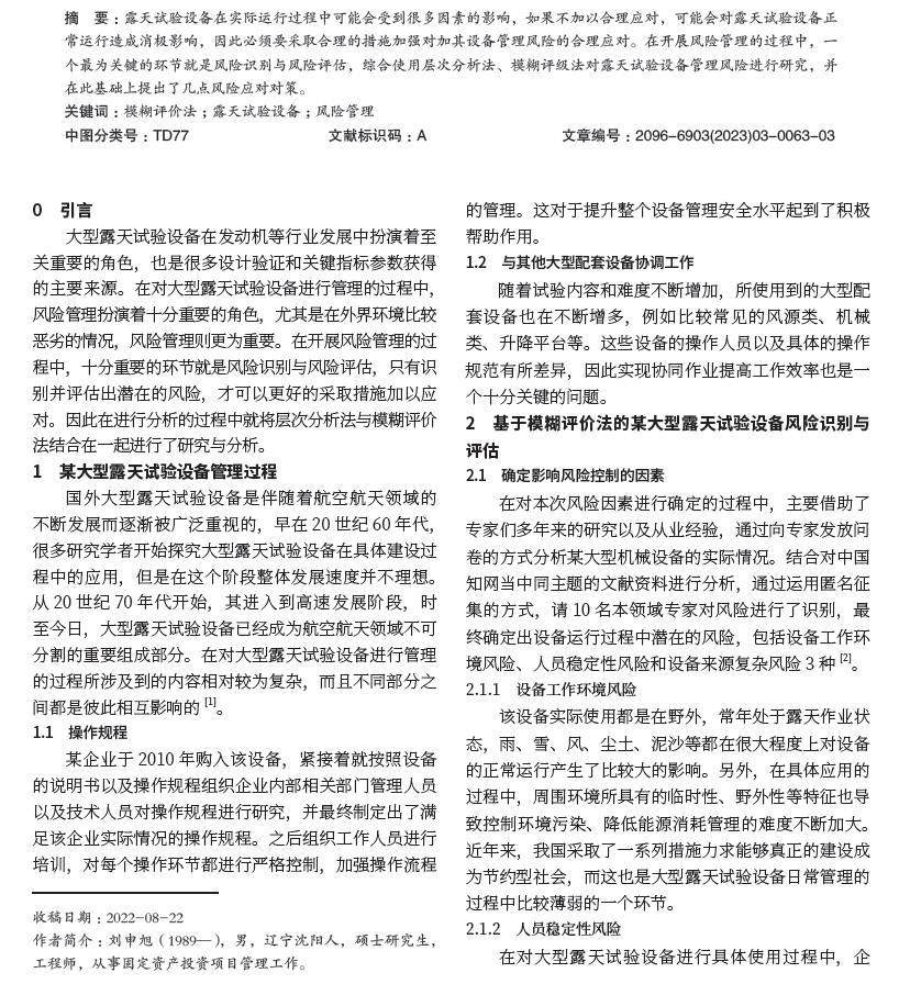 摘 要:露天试验设备在实际运行过程中可能会受到很多因素的影响,如果不加以合理应对,可能会对露天试验设备正常运行造成消极影响,因此必须要采取合理的措施加强对加其设备管理风险的合理应对。在开展风险管理的过程中,一个最为关键的环节就是风险识别与风险评估,综合使用层次分析法、模糊评级法对露天试验设备管理风险进行研究,并在此基础上提出了几点风险应对对策。(剩余4275字)