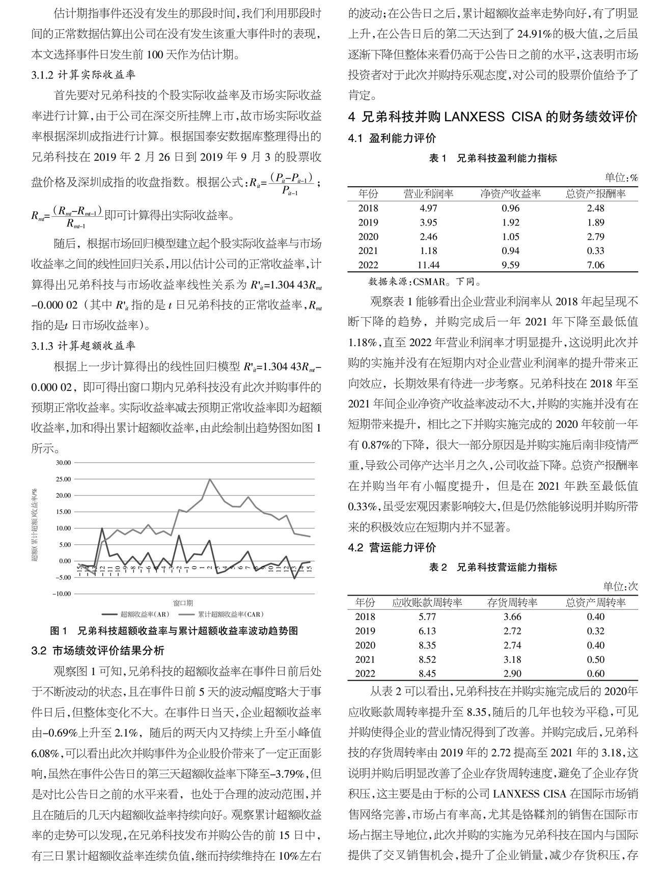 【摘 要】随着全球经济一体化程度的不断加深,企业并购浪潮席卷而来,越来越多的企业想要通过并购实现快速扩张,但是并购能否实现企业初衷,能否提高企业绩效值得深入探究。论文以兄弟科技并购LANXESS CISA为例,运用事件研究法及财务指标分析法对企业并购绩效进行评价,结果表明:市场对此次并购较为看好,为兄弟科技的股价带来正向影响;同时并购在一定程度上降低了企业盈利能力及短期偿债能力,并对兄弟科技的营运及发展能力带来积极影响。(剩余5051字)