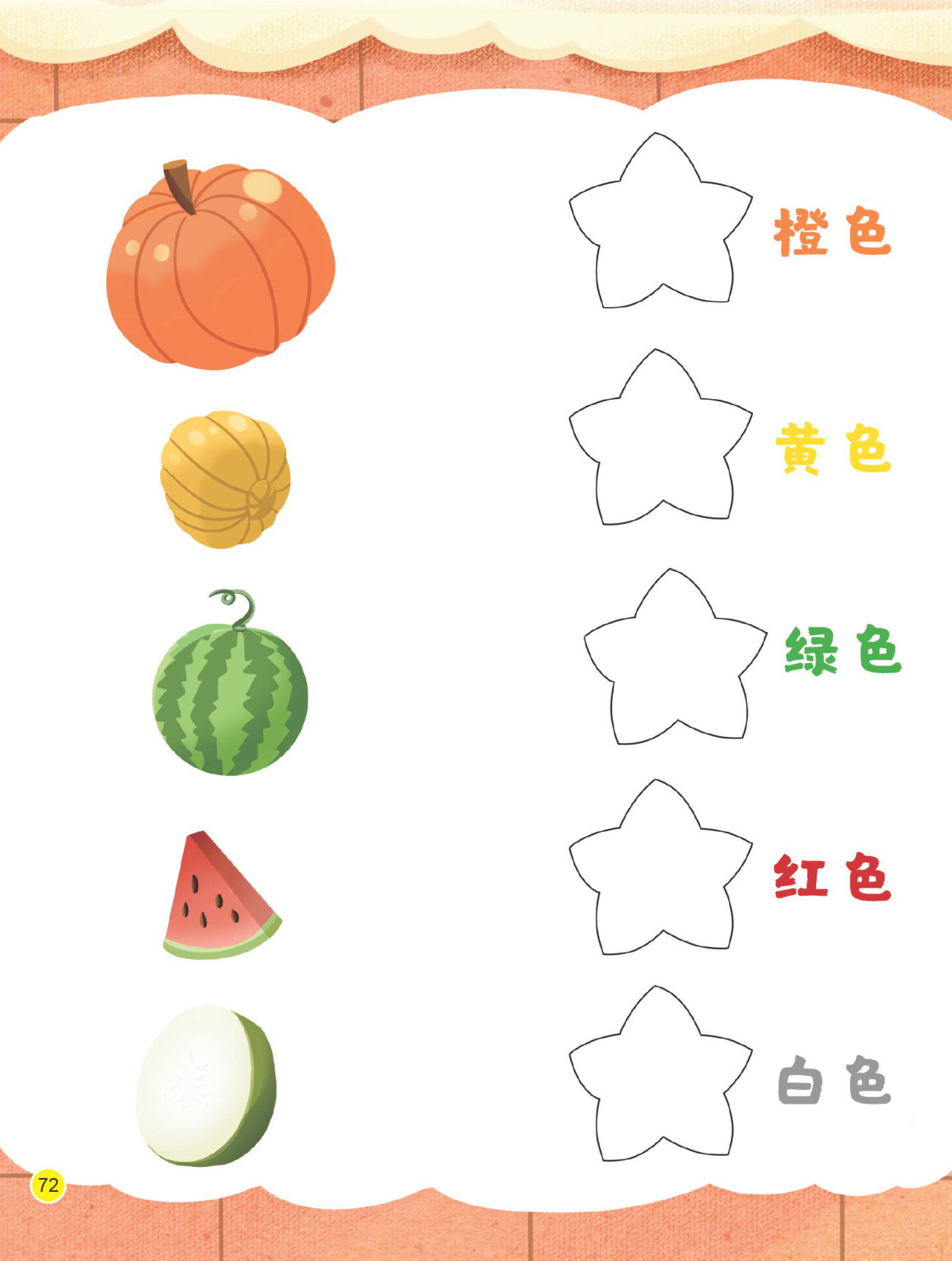 玩法说明:请小朋友们仔细观察左侧的瓜果,说一说“它们是什么瓜”,并将你观察的颜色涂在右侧对应的星星里。