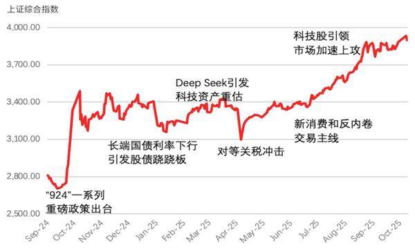 转眼间,本轮A股牛市已经一周年了。这一年里中国资产领涨全球股市,从2024年9月24日至2025年10月10日,上证综指上涨41.8%,沪深300指数上涨43.7%,创业板指数上涨103.4%,科创50指数上涨125.9%,香港恒生指数上涨44.1%。