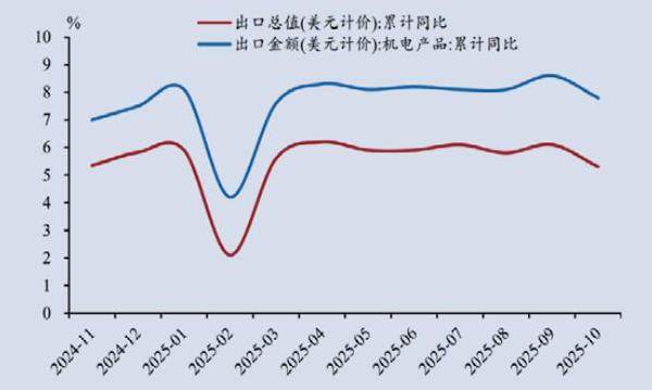 2025年以来,出口累计增速的稳定表现,很大程度源于机电产品的强劲支撑。前三季度,机电产品对出口贡献5.1个百分点,而“新三样”(新能源汽车、锂电池、光伏产品)产品贡献2.5个百分点,“新三样”对出口的贡献是机电产品贡献的一半。尽管“新三样”在机电产品出口总额中占比仅7.5%,但其对机电产品增长的贡献度却高达50%左右。(剩余372字)