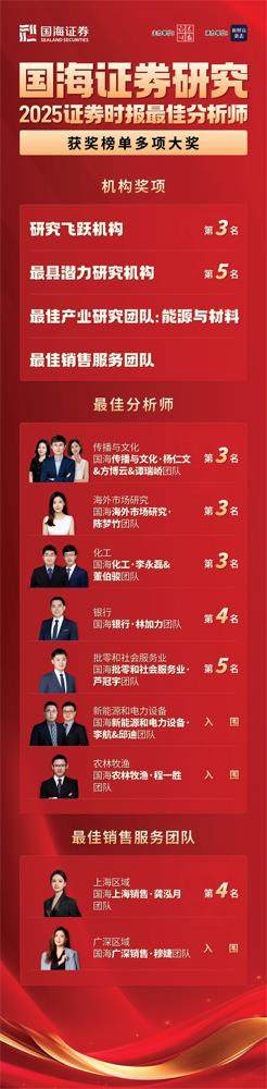 12月17日,2025《证券时报》分析师年会暨最佳分析师颁奖典礼在苏州举行。凭借专业的研究能力、扎实的服务水平,国海证券荣获研究飞跃机构、最具潜力研究机构、最佳产业研究团队:能源与材料、最佳销售服务团队等4项机构奖项;7个分析师团队入围最佳分析师榜单;最佳销售服务团队奖评选中,有2个团队入围最佳销售服务团队榜单。(剩余750字)