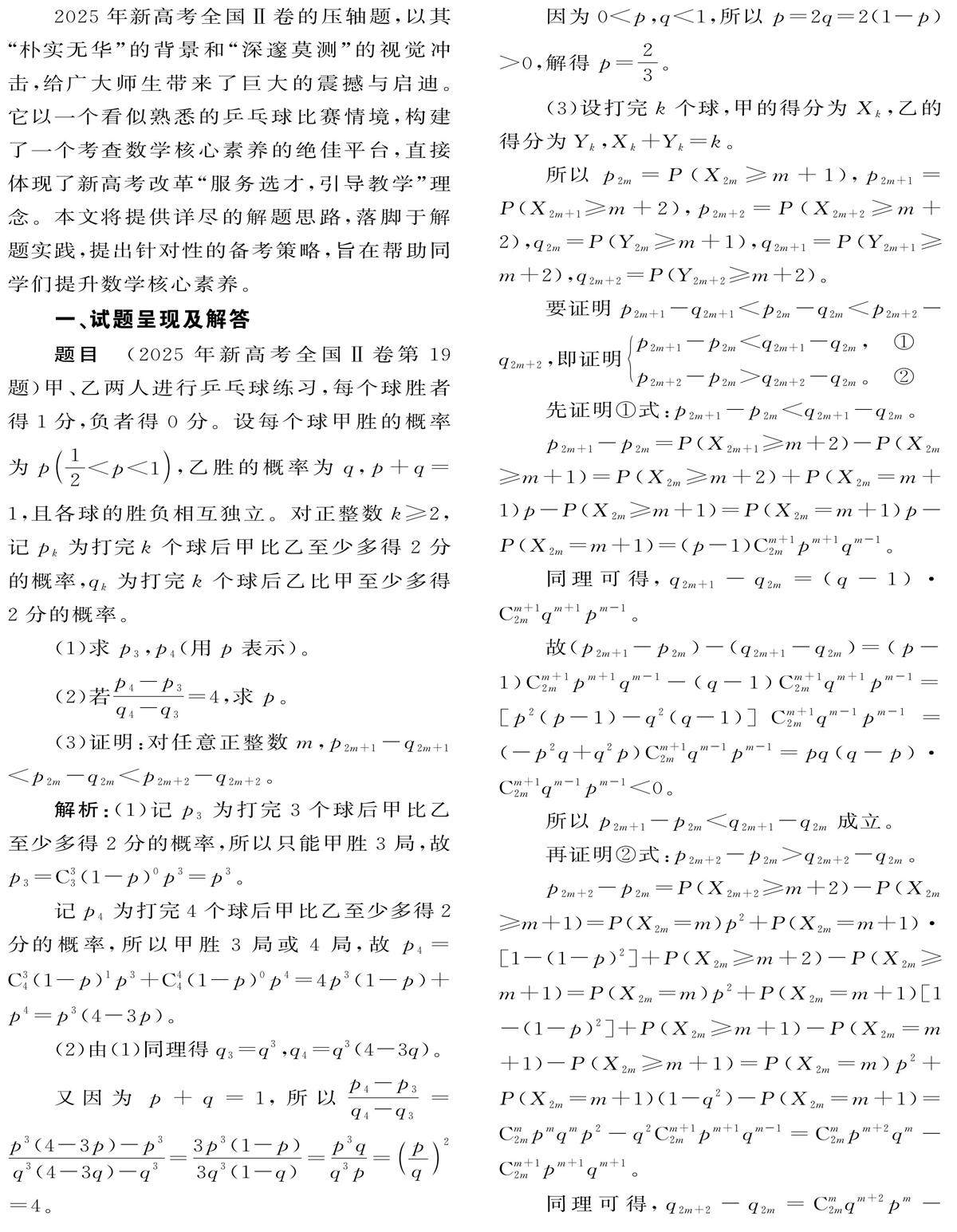 2025年新高考全国Ⅱ卷的压轴题,以其“朴实无华”的背景和“深邃莫测”的视觉冲击,给广大师生带来了巨大的震撼与启迪。它以一个看似熟悉的乒乓球比赛情境,构建了一个考查数学核心素养的绝佳平台,直接体现了新高考改革“服务选才,引导教学”理念。本文将提供详尽的解题思路,落脚于解题实践,提出针对性的备考策略,旨在帮助同学们提升数学核心素养。(剩余0字)