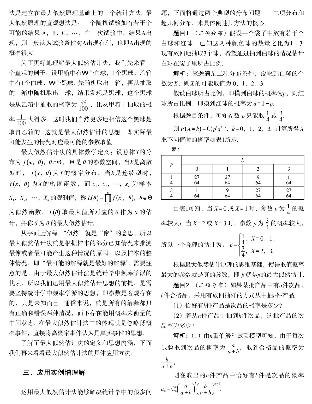 摘 要:统计问题解法背后的思想往往很重要,但却常常被忽视. 最大似然估计就是统计学中一个很重要的思想与方法. 从教材例题出发,深入剖析最大似然估计的定义与内涵,并结合二项分布和超几何分布的问题实例阐明其应用方法,在此基础上再拓展介绍最小二乘法和贝叶斯估计法,以及它们与最大似然估计法的区别(剩余7924字)