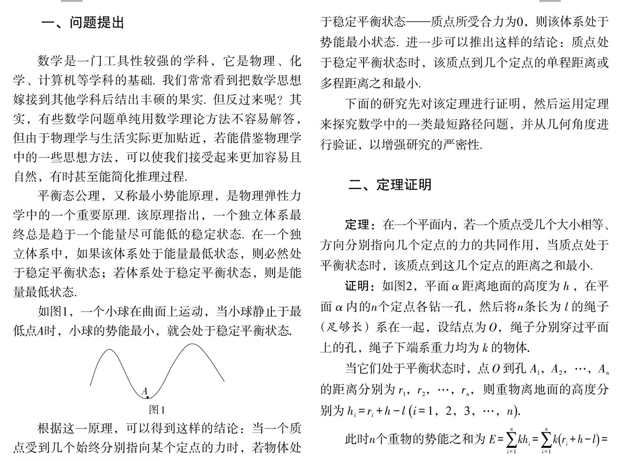 摘 要:平衡态公理,又称最小势能原理,是物理弹性力学中的一个基本原理. 该原理指出,在一个独立体系中,如果该体系处于势能最低状态,则必然处于平衡状态. 研究旨在从物理学的视角出发,以平衡态公理为物理模型,重新思考和探究几何中一类最短路径问题,以使该类最短路径问题的结论更加明晰且自然.